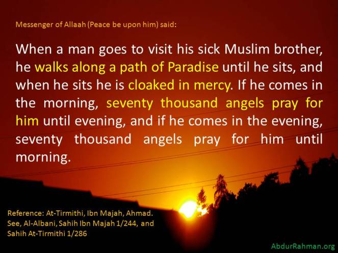 When a man goes to visit his sick Muslim brother, he walks along a path of Paradise until he sits, and when he sits he is cloaked in mercy. If he comes in the morning, seventy thousand angels pray for him until evening, and if he comes in the evening,seventy thousand angels pray for him until morning.