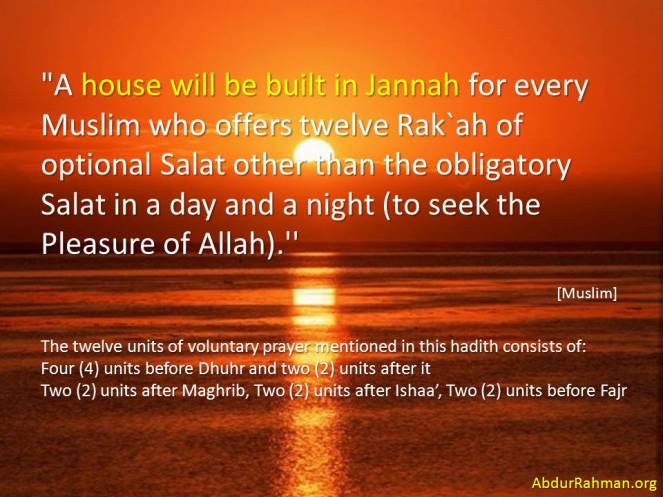 Umm Habibah (May Allah be pleased with her) the Mother of the Believers reported: I heard the Messenger of Allah (sallallaahu ’alayhi wa sallam) saying, “A house will be built in Jannah for every Muslim who offers twelve Rak`ah of optional Salat other than the obligatory Salat in a day and a night (to seek the Pleasure of Allah).”
