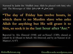 “The day of Friday has twelve hours, in which there is no Muslim slave who asks Allah for anything but He will grant it to him, so seek it in the last hour after ‘Asr.”