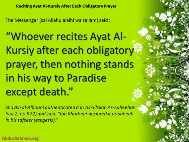 “Whoever recites Ayat Al-Kursiy after each obligatory prayer, then nothing stands in his way to Paradise except death.”