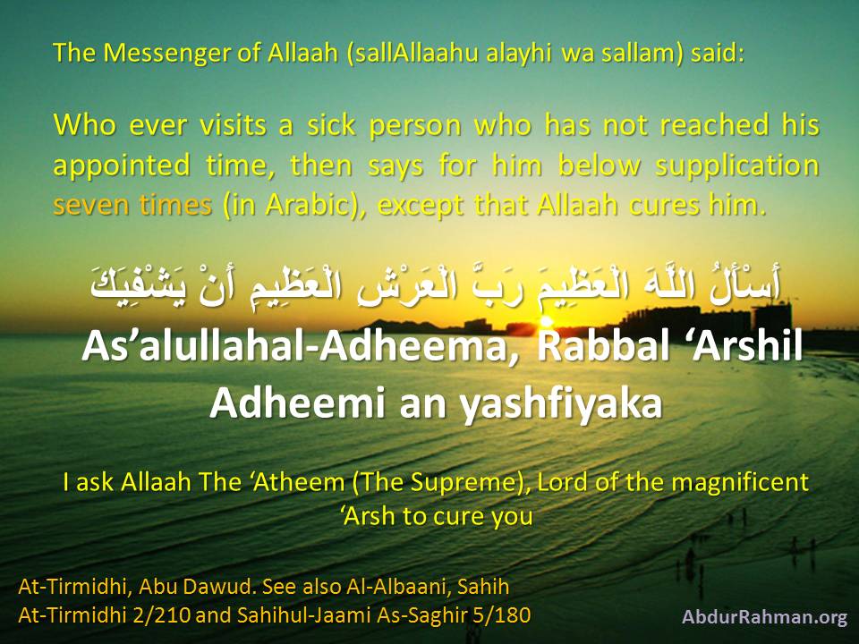 I ask Allaah The ‘Atheem (The Supreme), Lord of the magnificent ‘Arsh to cure you –