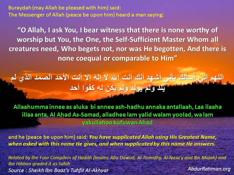 “O Allah, I ask You, I bear witness that there is none worthy of worship but You, the One, the Self-Sufficient Master Whom all creatures need, Who begets not, nor was He begotten, And there is none coequal or comparable to Him”