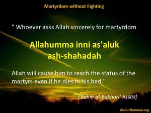 “Whoever asks Allah sincerely for martyrdom [Allahumma inni as’aluk ash-shahadah], Allah will cause him to reach the status of the martyrs even if he dies in his bed.” [‘Sahih al-Bukhari’; # 1909]‘