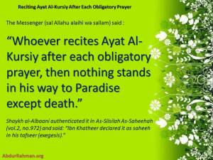 Reciting Ayat Al-Kursiy After Each Obligatory Prayer August 8, 2011 AbdurRahman.org Share this, Baarak Allaah Feekum: Print (Opens in new window) Print Email a link to a friend (Opens in new window) Email Share on X (Opens in new window) X Share on Facebook (Opens in new window) Facebook Share on LinkedIn (Opens in new window) LinkedIn More Share on Reddit (Opens in new window) Reddit Share on Tumblr (Opens in new window) Tumblr Share on Pinterest (Opens in new window) Pinterest Like Loading... Published by AbdurRahman.org View all posts by AbdurRahman.org Share this, Baarak Allaah Feekum: Print (Opens in new window) Print Email a link to a friend (Opens in new window) Email Share on X (Opens in new window) X Share on Facebook (Opens in new window) Facebook Share on LinkedIn (Opens in new window) LinkedIn More Share on Reddit (Opens in new window) Reddit Share on Tumblr (Opens in new window) Tumblr Share on Pinterest (Opens in new window) Pinterest Like Loading...